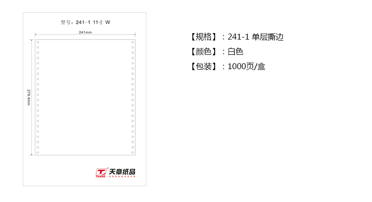 商品名称:天章(TANGO)新绿天章一联整张撕边电脑打印纸 针式打印纸241-1S(色序:全白 1000页/箱)